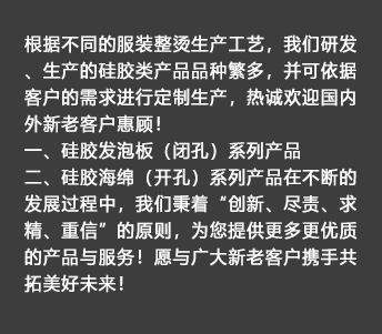 專業(yè)生產(chǎn)硅橡膠發(fā)泡產(chǎn)品的企業(yè),主要致力于硅膠發(fā)泡類產(chǎn)品的研發(fā)與生產(chǎn)    主要分兩大類——硅膠發(fā)泡板(閉孔)系列產(chǎn)品與硅膠海綿(開孔)系列產(chǎn)品